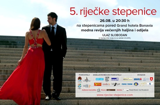 Modna revija večernjih haljina i odijela renomiranih modnih kuća i dizajnera 5. Riječke stepenice, održati će se 26. kolovoza u 20:30h na stepenicama pored Grand hotela Bonavia. Kolekcije jesen/zima na najvećoj modnoj manifestaciji u regiji u prelijepom ambijentu kamenih stepenica u centru grada predstaviti će: RIO, Gena, Varteks, Lurex, Martin Arbanas, Vesna Sposa, Callegari, Marijana Hero, Eni Surian, Milena Kapetanović-Peperoncina design, Andrea Anić, Petra Fledrović, očna optika Ghetaldus Rijeka, kožna galanterija Galko i dizajnerica Iva Srok Tucić sa kolekcijom nakita.